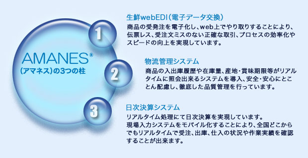 日次決算によりスピード経営を実現しております。先進的な技術をを統合し、仙台水産が独自に構築した生鮮卸売市場総合情報システム『AMANES(アマネス)』は、商品のトレースバックを可能にするとともに、関連企業や取引先と情報の共有化を推進し、流通全体の合理化にも貢献しています。