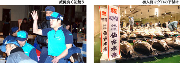 市場開設者の奥山恵美子仙台市長は「市民の台所としての1年が始まります。安全安心、地産地消をモットーに、精一杯おいしい食を提供してください。」と挨拶、最後に本年の商売繁盛を願い全員で手締めをした後、鐘の音を合図に一斉に初競りが始まり2011年の市場取引が幕を開けました。
