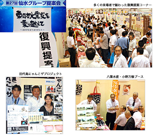 今回の仙水グループ提案会は被災地メーカー・生産者の復興支援をメーンコンセプトに置き、その他多彩な内容で開催され、量販店や小売、業務筋、市場関係者ら2442人が来場されました。会場には復興を目指す三陸の74の生産者、出荷者、加工業者が「復興提案コーナー」に出展、復旧の現状や今後の生産見通し、復興への取り組みなどをパネル展示やパンフレットで説明し、早期再生への姿を来場者にアピールしました。