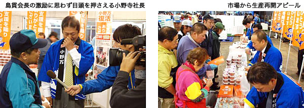 おかげさまで生産再開・(株)小野万が市場で復興をアピール