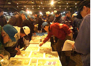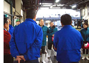 12月13日早朝、市場運営協議会の鈴木繁雄会長はじめ仙台市議会議員の皆さんが、歳末商戦で活気付く仙台市場の激励に訪れました。仙台水産の鮮魚売場では、なめたがれいやマグロなど、年末に向けての入荷量や値動きなどの説明を受けていました。