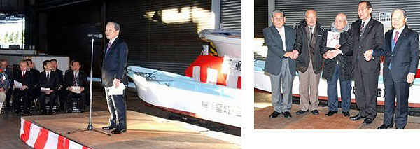 「三重・宮城“絆”プロジェクト」と命名された「絆漁船」は約700キロ離れた三重県から13時間かけて陸送されて来ました。12月18日早朝仙台市場で行われた贈呈式には三重県漁連から永富洋一会長以下3人、梶塚善弘宮城県農林水産部水産業振興課長、佐々木一十郎名取市長、佐々木直哉閖上水産加工業組合理事長、櫻井広行ゆりあげ港朝市組合理事長、島貫仙台水産会長以下役職員、贈呈を受ける漁師の高田忠正さん以下3人と市場関係者165人が出席して行われました。仙台水産は今後、三重県漁連の2隻を含めた13隻の小型漁船を順次提供する予定で、これまでの朝市支援とともに閖上の水産復興を全面支援していきます。