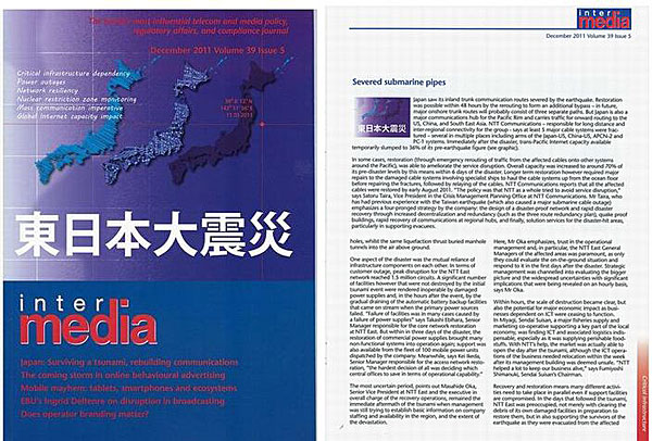10月12日イギリス・ロンドンのメディア「intermedia」が仙台水産の取材に訪れ、このほど世界中に発信されました。内容は、震災発生直後NTT東日本災害対策本部における対応のおかげで生鮮市場のシステムが素早く復旧したことについて述べています。具体的には、被災ビルからの移転に伴う電話線、光ファイバーケーブル移設など生鮮食料品流通に欠かせないシステムインフラ55回線の復旧に素早く対応していただき、食料パニックを防げたことを取材していきました。