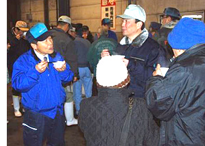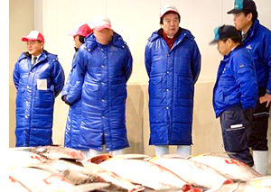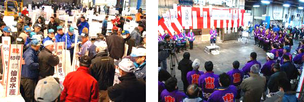 1月5日早朝、新春恒例の仙台市中央卸売市場水産物部業務開始式が市場開設者など行政関係者や市場関係者の皆さんが参加して威勢よく行われました。市場開設者の奥山恵美子仙台市長は「この1年は仙台、宮城にとって復興への1年となる。何よりも食。市場から供給し、この1年、持てる水産物部の元気を宮城に届けよう」と挨拶しました。業界代表として挨拶に立った島貫文好仙台水産会長は「市場は51年目に入り輝かしい将来へのスタートになった。震災もあったが市場から皆さまに元気を発信したい」と述べました。復興元年の商売繁盛を願い全員で手締めをした後、鐘の音を合図にセリが開始されると仲買人らの威勢のいい声が場内に響き渡り2012年の市場取引が幕を開けました。
