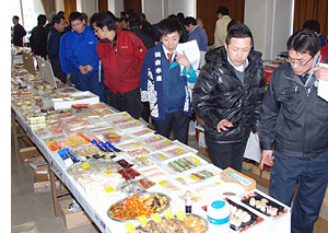 加工品部と惣菜業務食材部は2月8日、仙台市場内でメーカー様103社に出展いただき、ねり製品をはじめ水産惣菜、水産加工品、日配品など、旬を意識した様々な商品約1000アイテムを展示・提案しました。提案会場には市場関係者、小売店、外食関係の多数の方々が真剣な眼差しで売れる商品を吟味、活発な商談を行っていました。