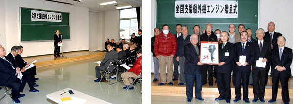 震災で被災した名取市閖上のアサリ・シジミ漁業者に、仙台水産の働きかけで北海道の漁協などから寄贈された小型漁船用エンジンが2月10日、名取市商工会館で贈呈されました。
