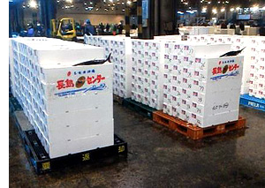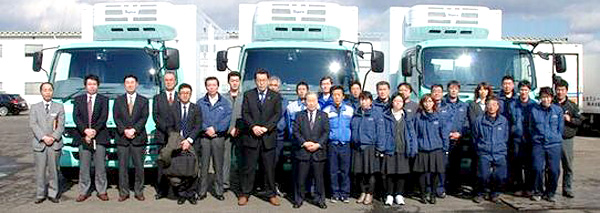 これは昨年の震災後、仙台水産グループ復興の一環として宮城県に申請し、認定された補助金の利用により購入したものです。同日行われた納車式では、鈴木社長が新車3台を前に安全運行祈願を行い、「震災後の復興に向け、待望の新車納入を機に今後ますます安全運転、安全作業に取り組みグループに貢献しよう」とあいさつしました。来賓の島貫仙台水産会長は、「皆さんの努力、一致団結と協力で今後も頑張ってほしい」と社員を激励しました。3台は早速、地方出荷分の定期便として運行に組み込まれ稼動を始めました。