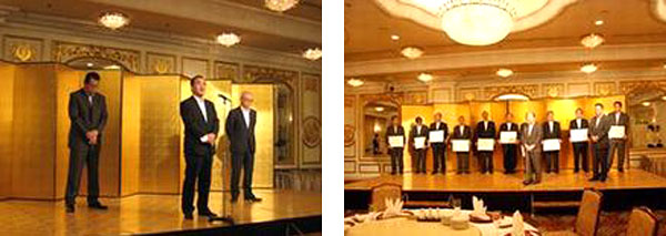 賀会では仙水グループのホールディング会社である(株)仙台商産の島貫文好代表取締役会長が祝賀会の主旨について挨拶を述べた後、熊谷純智仙台水産代表取締役社長、鈴木隆志仙台水産専務取締役、鈴木良徳丸水配送ならびに仙台食品代表取締役社長の就任祝いが行われました。その後、経営目標を達成されたグループ会社10社に島貫会長から表彰状の授与が行われました。当日は仙水グループ幹部の方々53名が出席し、仙水グループ合唱団「御神船」の歌が披露されるなど大いに盛りあがり、24年度グループ各社の更なる発展を誓い合っていました。