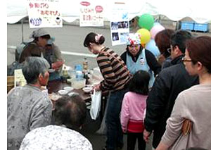 調理は食育NPO「おむすび」(清水智子代表)のメンバーと仙台水産社員が協力して行いました。山元町の仮設住宅に住み加工連から招待されたという門間進さん(69)は、お土産に冷凍しじみをプレゼントされ「仮設の仲間26人と来ました。小川水産さんありがとう」と笑顔で話していました。