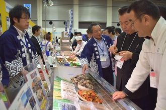 会場中央に設けられた「仙水グループイチオシ商品コーナー」では、グループがこれまで開発してきた商品を一堂に提案しました。CAS凍結やプロトン凍結した商品、高圧処理した殻付きカキをはじめ、減塩、骨取りなど、多岐にわたる仙水グループ独自の商品を提案しました。