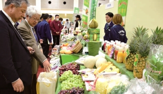 ▲彩りも鮮やかな青果、活発な商談が行われた