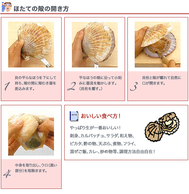 みなさんに、おいしい旬の魚を存分に味わっていただきたい !! そんな思いから、ここでは、魚のおいしい食べ方・捌き方をご紹介します。 今回は「ほたての殻の開き方」です。