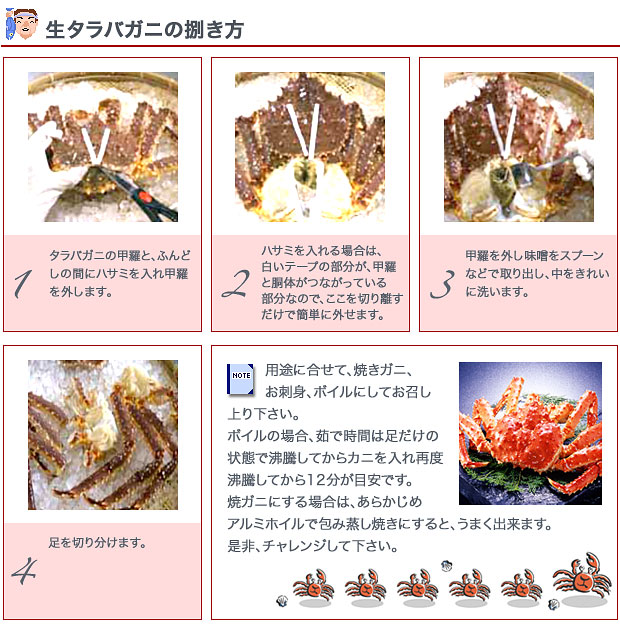 みなさんに、おいしい旬の魚を存分に味わっていただきたい !! そんな思いから、ここでは、魚のおいしい食べ方・捌き方をご紹介します。 今回は「生タラバガニ」です。