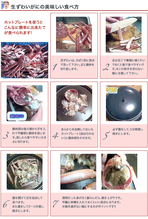 みなさんに、おいしい旬の魚を存分に味わっていただきたい !! そんな思いから、ここでは、魚のおいしい食べ方・捌き方をご紹介します。 今回は「生ずわいがに」のホットプレートを使った食べ方です。