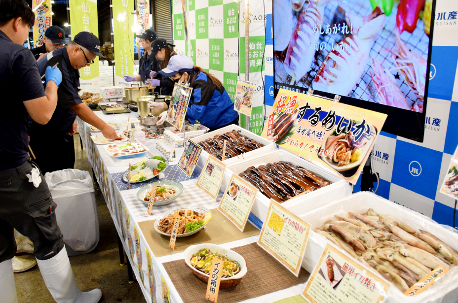 仙台水産は仙台あおば青果と共催で9月27日早朝、仙台卸売市場で今シーズン好漁の「スルメイカ」の試食提案会を開き、消費拡大をアピールしました。