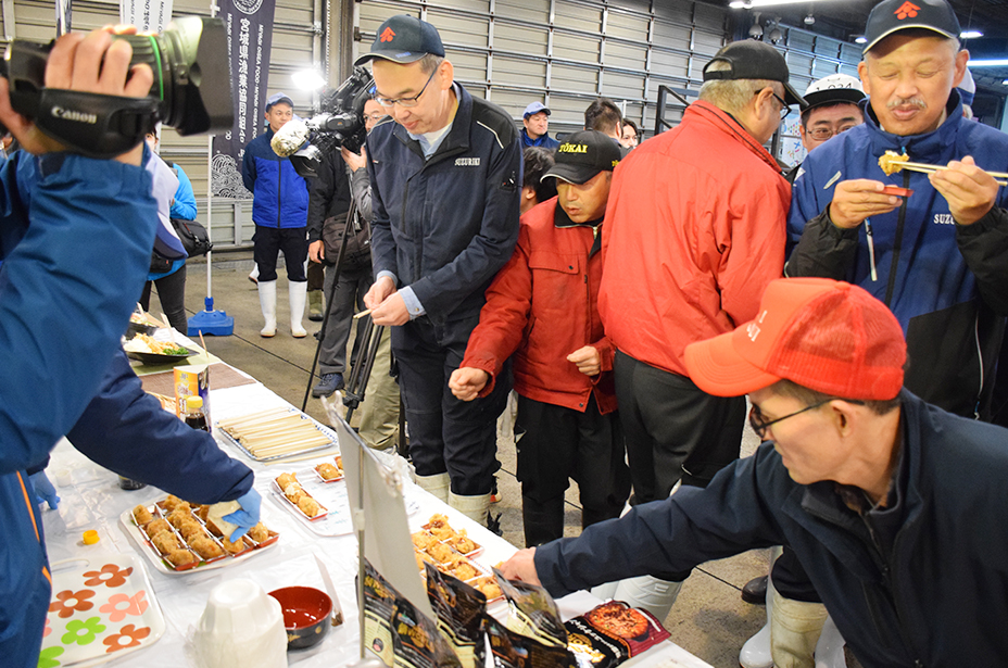 会場では殻付カキや生カキ、カキ加工製品の展示と、カキ飯やカキソテーねぎ塩だれ、カキお好み焼きなどのおすすめメニュー6品が提案されました。試食は、カキフライとカキと旬野菜の汁物、約350食が買受人らに振る舞われ好評を博しました。