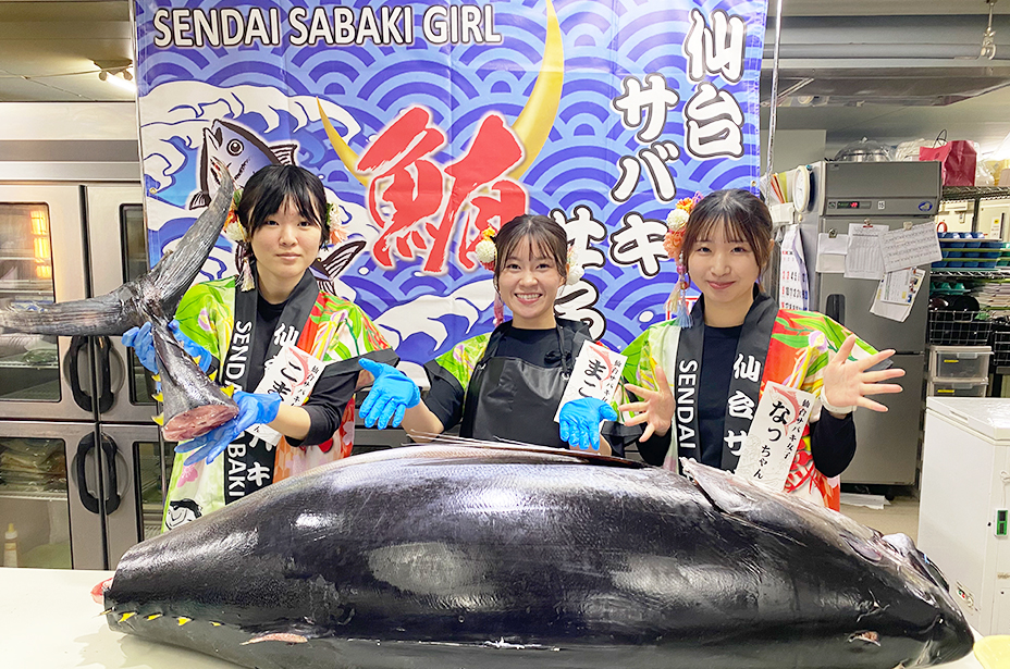 仙台サバキ女子は11月11日、東北大学川内キャンパス内「川内の杜ダイニング」で生マグロの解体ショーを行い、多くの学生達に魚の消費喚起を行いました。