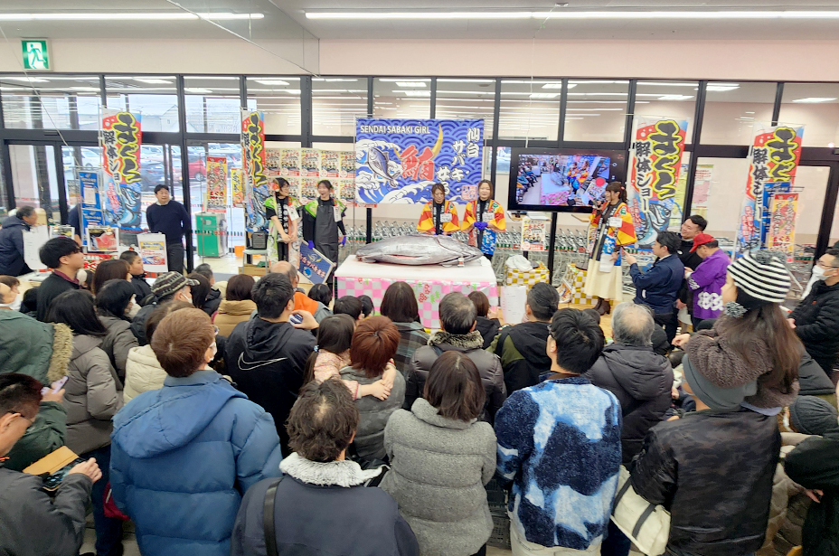 仙台サバキ女子は1月5日午後、秋田県内のスーパーマーケットで、仙台卸売市場の初セリまぐろで解体ショーを行い、来店されたお客様に魚の消費喚起を行いました。