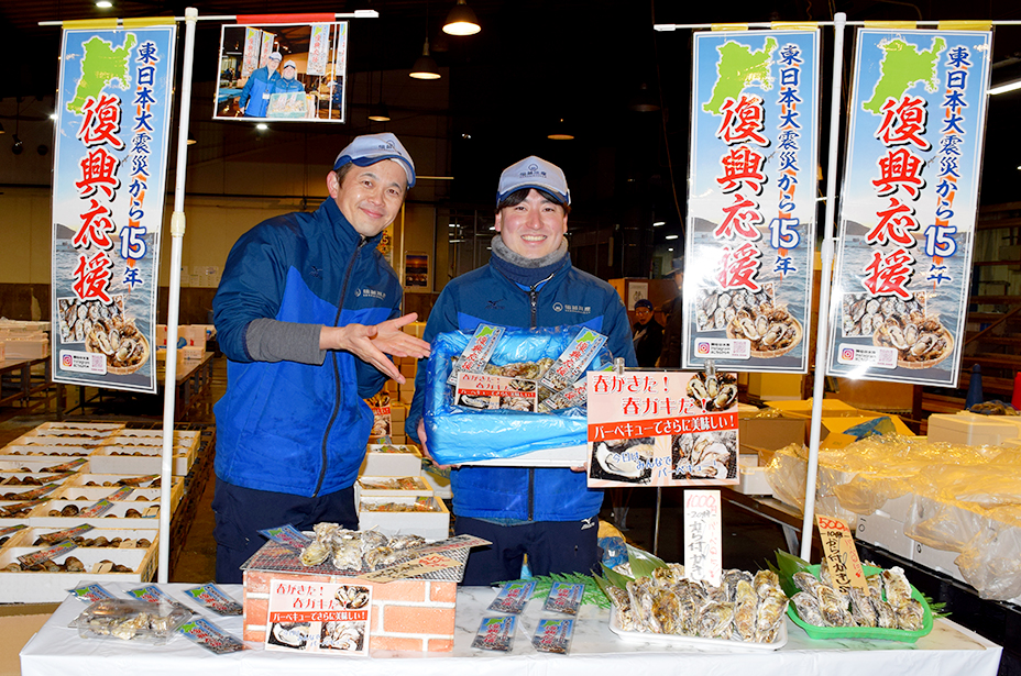 東日本大震災から15年を前にした3月9、10日の両日、仙台水産は宮城県産カキの復興応援と銘打ち「宮城県産冷凍殻付カキ」の提案を仙台卸売市場で行いました。