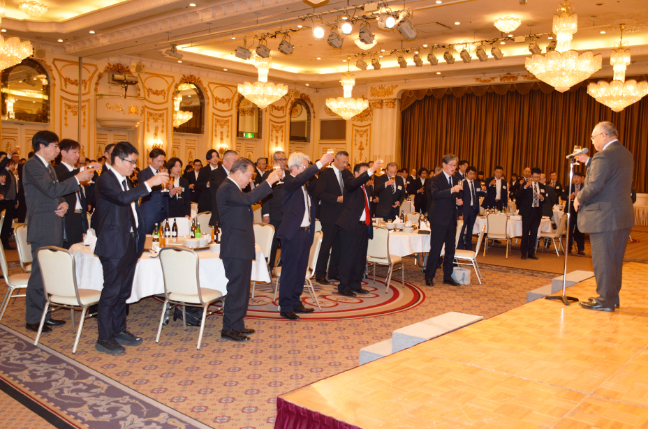 伊藤真仙台食品社長が乾杯発声をしたあと祝宴に入り、全社長らが登壇して一言ずつ新年の抱負を述べました。会は、グループ24社の役職員が一堂に会し、親睦を深めるとともに新年の門出をなごやかに祝いました。