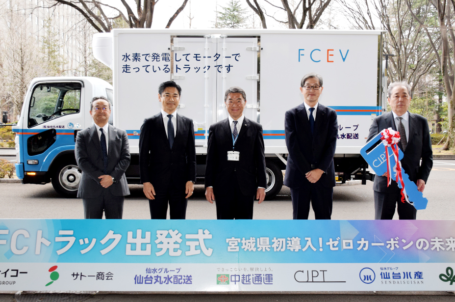県内初となる燃料電池で走る小型トラックの導入を記念した「FCトラック出発式」が2月5日、宮城県庁で行政関係者、導入事業者らが出席して行われました。