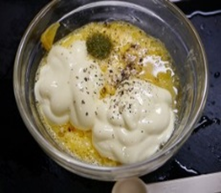 - 耐熱ボールに卵・マヨネーズを入れて混ぜ合わせ、ラップをせずにレンジで600w30秒温める。